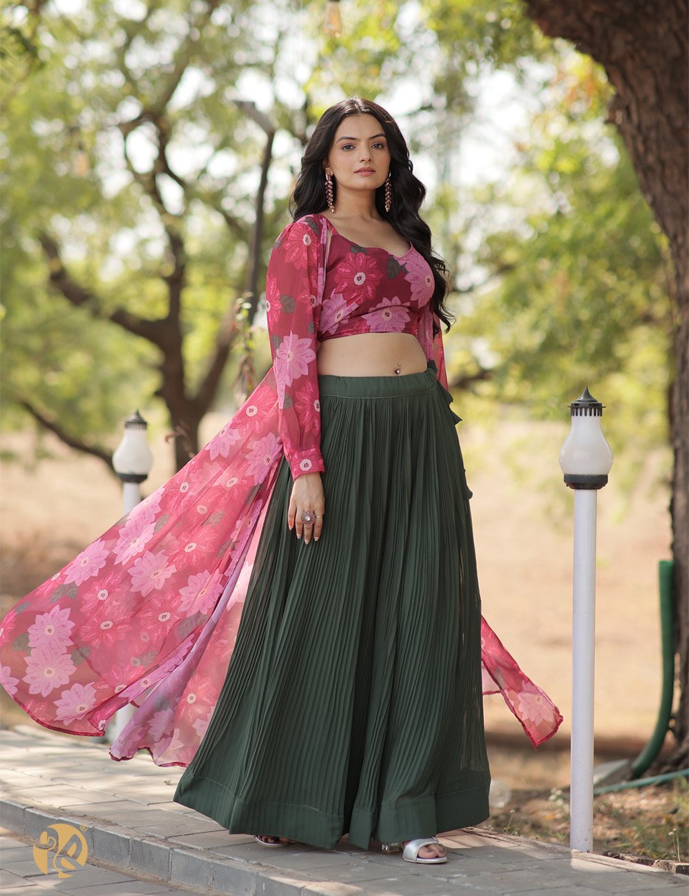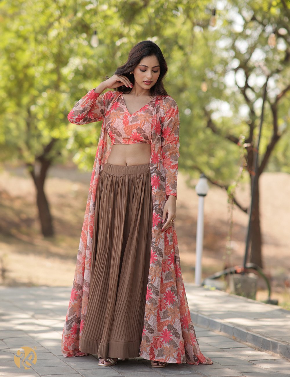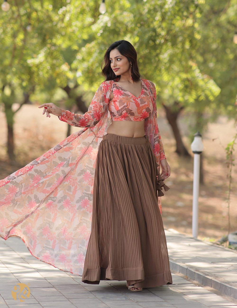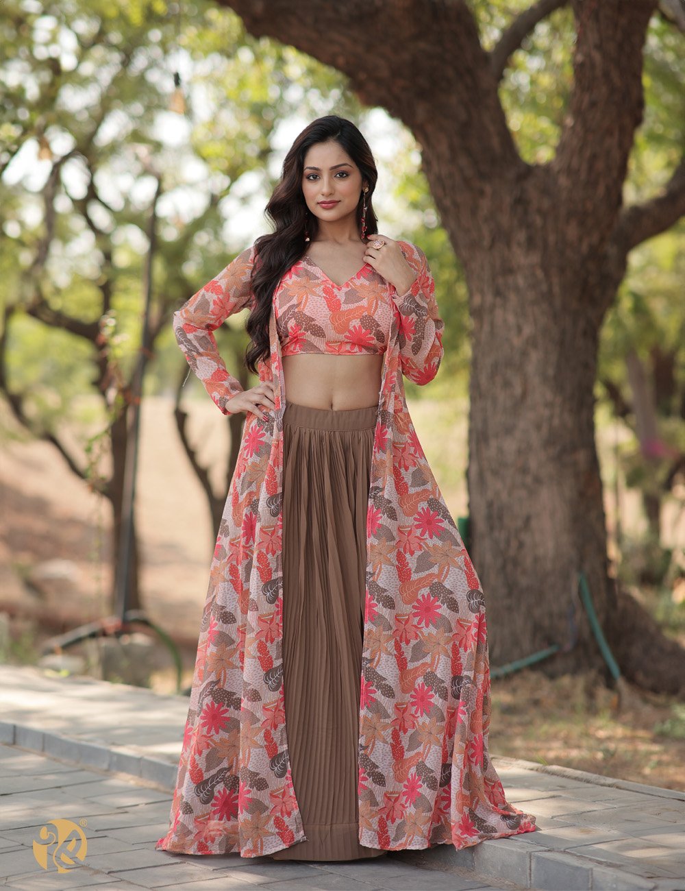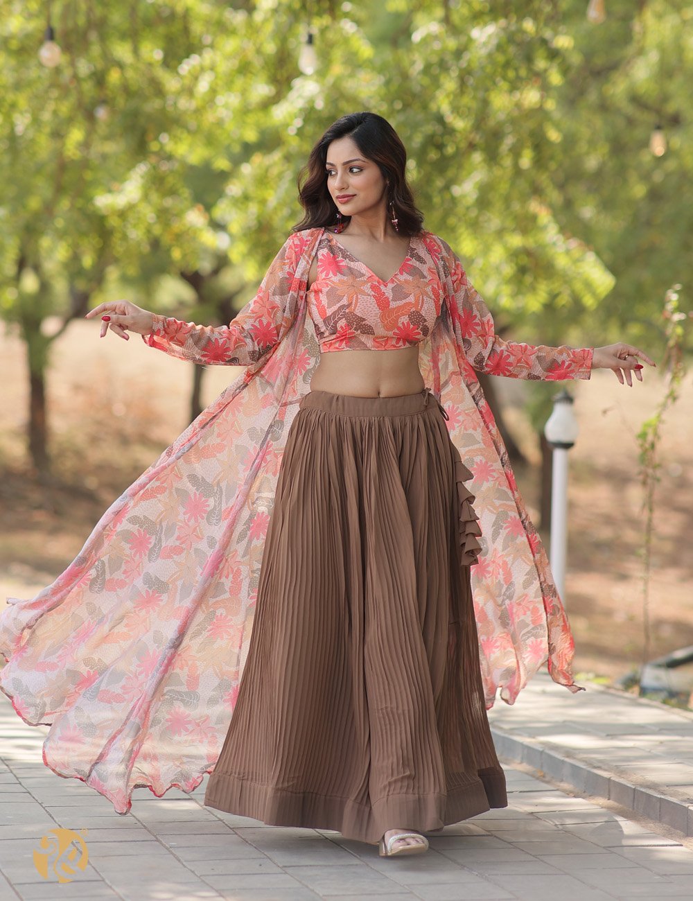 Karovi New Faux Georgette Lehenga with Digital Flower Print Choli and Shrug