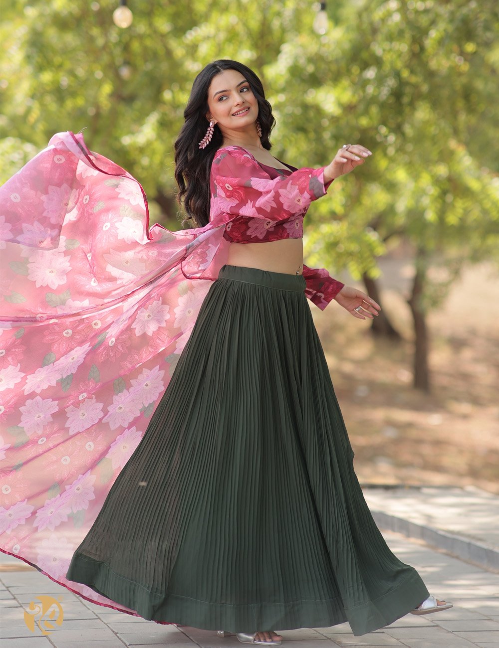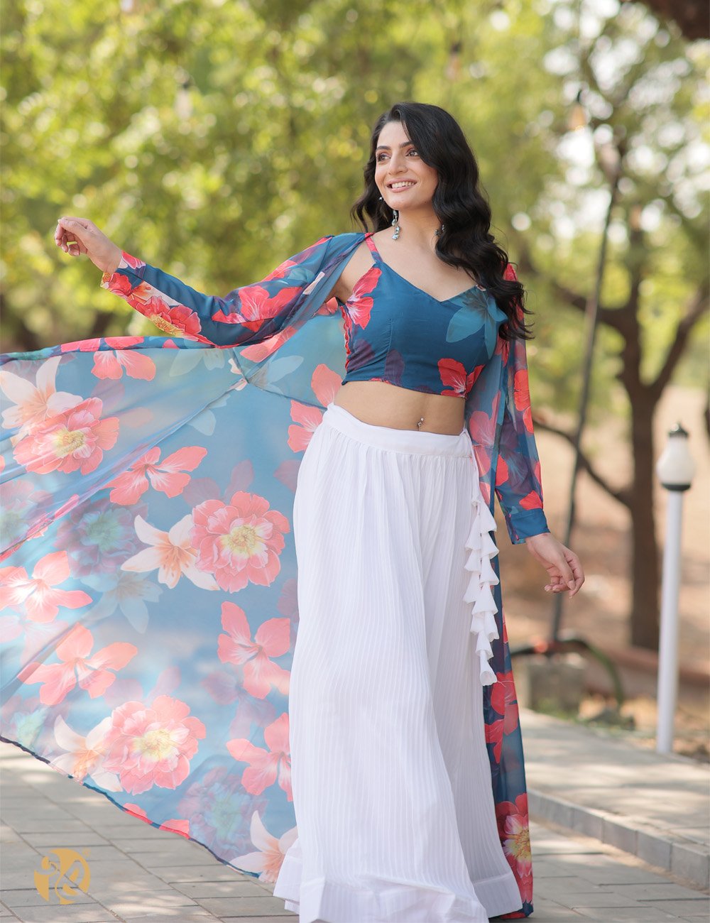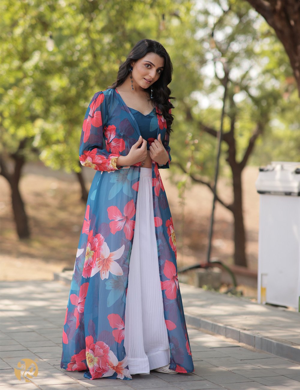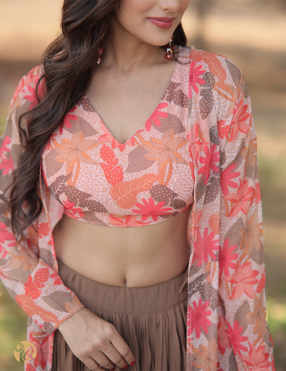 Karovi New Faux Georgette Lehenga with Digital Flower Print Choli and Shrug